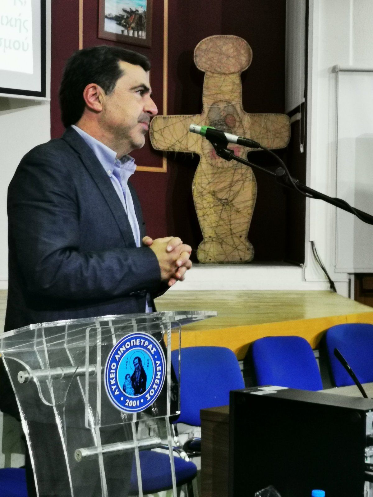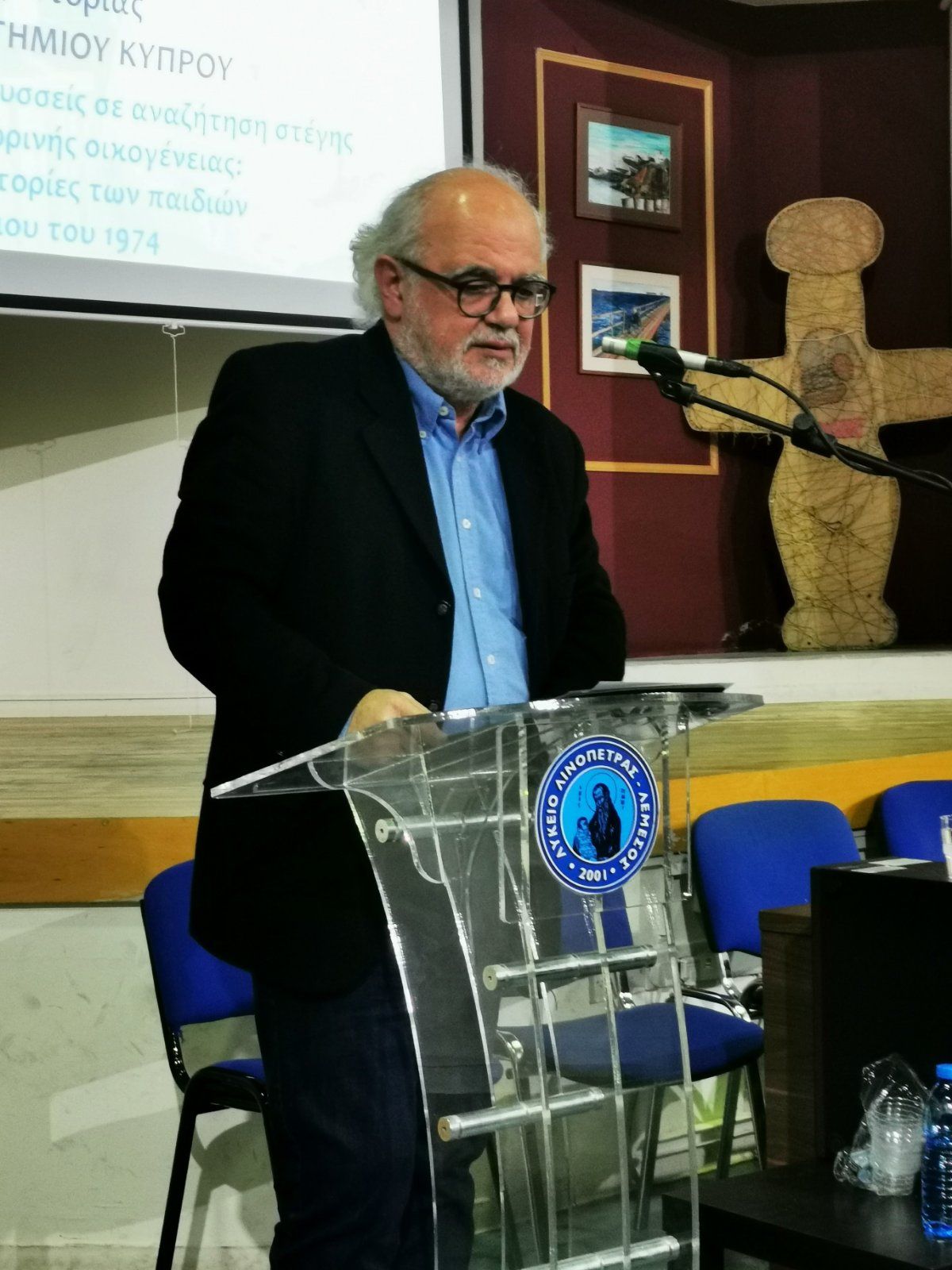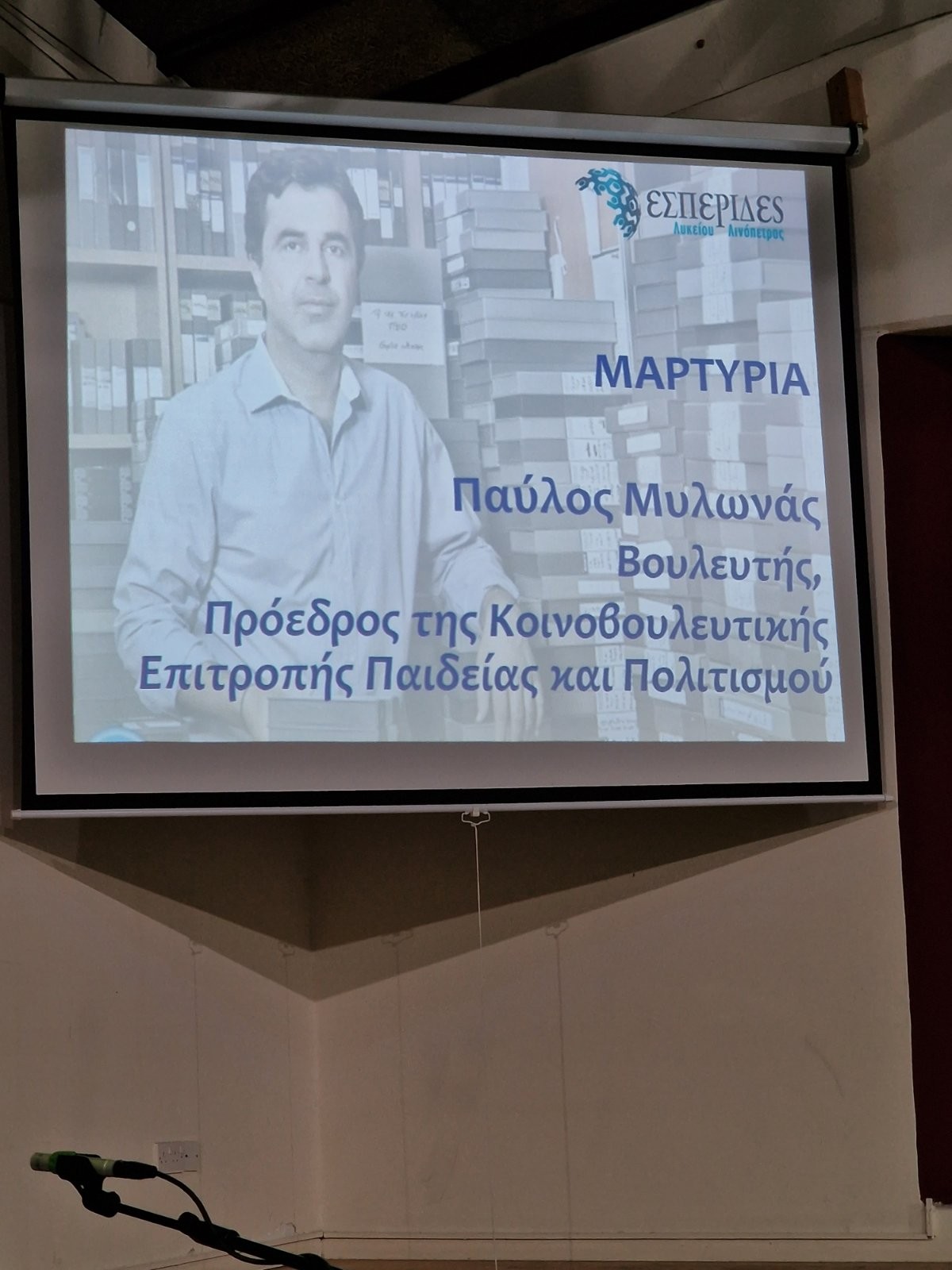 Μετά από σύντομους χαιρετισμούς από τον Διευθυντή του Σχολείου μας κ. Θεόκλητο Παραγυίου και την Πρόεδρο του Συνδέσμου Γονέων και Κηδεμόνων κ. Στέλλα Καμηλάρη, τον λόγο πήραν οι προσκεκλημένοι ομιλητές μας, Δρ. Πέτρος Παπαπολυβίου, Αναπληρωτής Καθηγητής Σύγχρονης Ιστορίας στο Πανεπιστήμιο Κύπρου ως εισηγητής της εκδήλωσης, ο κ. Παύλος Μυλωνάς, Βουλευτής και Πρόεδρος της Κοινοβουλευτικής Επιτροπής Παιδείας και Πολιτισμού, ο Δημοσιογράφος και Ιστορικός Ερευνητής κ. Μιχάλης Μιχαήλ και ο Β.Δ. καθηγητής Μαθηματικών και μέλος της ΟΕΛΜΕΚ κ. Γιάννης Νικολαΐδης.