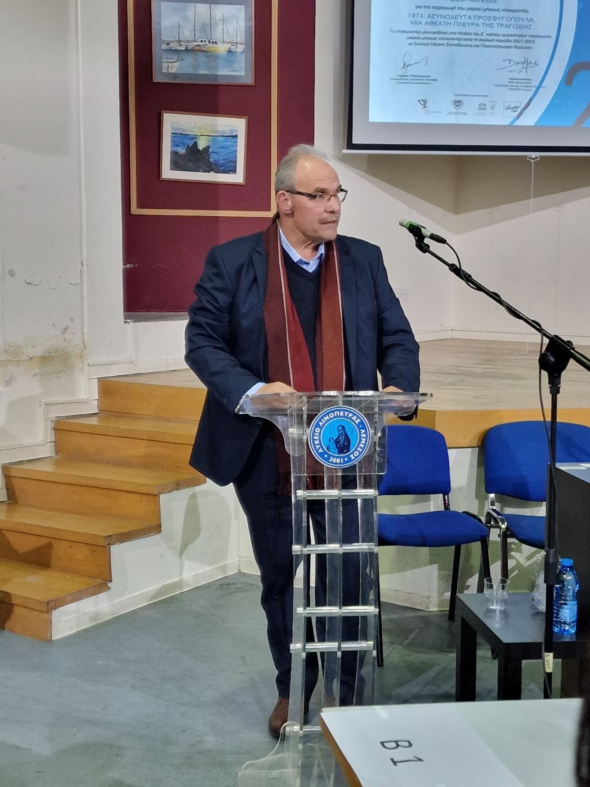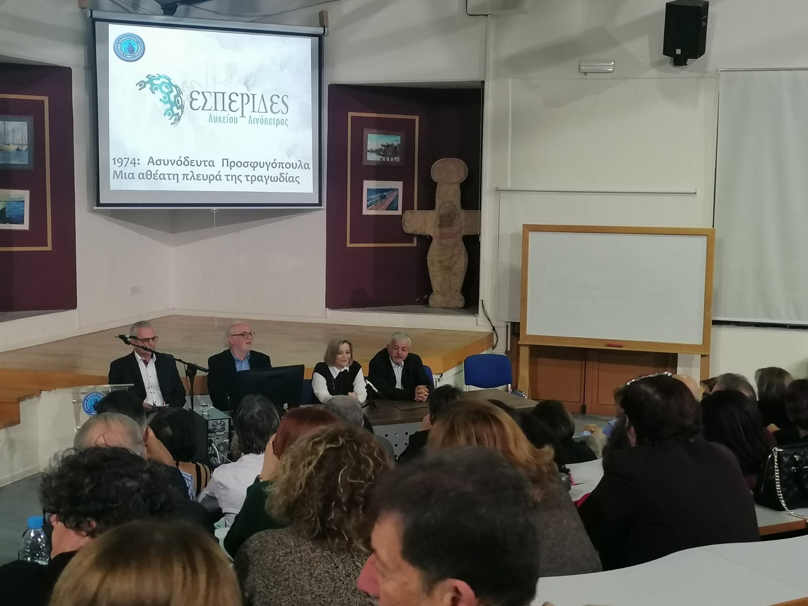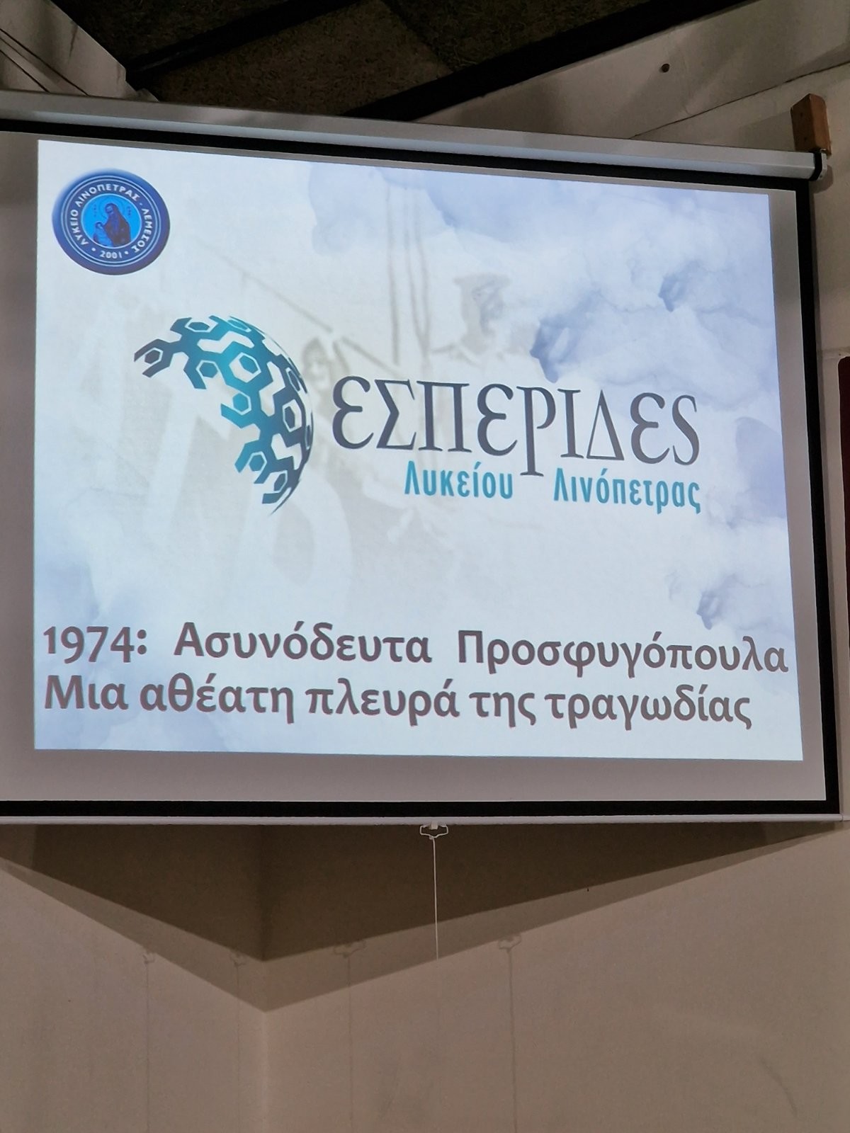 Μέσα σε μια αίθουσα κατάμεστη από συγκίνηση πραγματοποιήθηκε η εκδήλωση του Σχολείου μας με τίτλο «1974. Ασυνόδευτα προσφυγόπουλα. Μια αθέατη πλευρά της τραγωδίας», στην οποία προβλήθηκε και το βραβευμένο με Α΄ Παγκύπριο Βραβείο ομότιτλο ντοκιμαντέρ που δημιούργησε ομάδα μαθητών και μαθητριών μας, στο πλαίσιο του 5ου Φεστιβάλ Αρχαιολογικού, Εθνογραφικού και Ιστορικού Ντοκιμαντέρ.