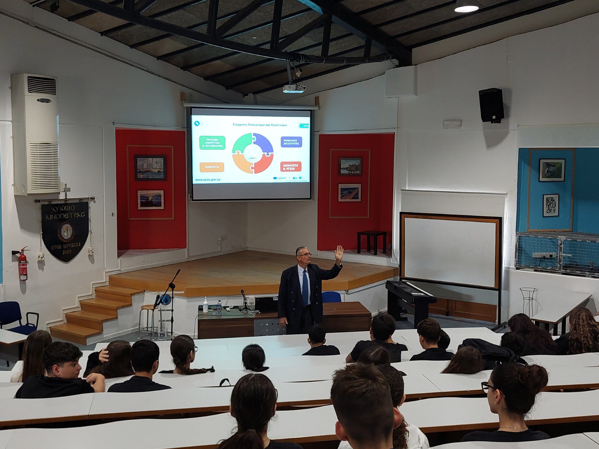 Στις 10/11/2025 πραγματοποιήθηκε διάλεξη από τον λειτουργό του ΚΕ.ΠΑ. κ. Θεοχάρη Κατράνη, με θέμα: "Ανάπτυξη νέας επαγγελματικής κουλτούρας-Νέα περιβαλλοντική κουλτούρα". Η διάλεξη έγινε στα πλαίσια των δράσεων της επιτροπής περιβαλλοντικής εκπαίδευσης του λυκείου μας, συνάμα όμως πραγματοποιήθηκε ενημέρωση για σχετικά με το θέμα επαγγέλματα. Τη διάλεξη παρακολούθησαν οι μαθητές των τμημάτων Α21, Α22 και Α41. Την ευθύνη για τη διοργάνωση είχε ο Β.Δ. Ανδρέας Σοφοκλέους.